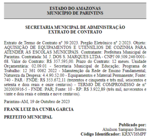 A prefeitura de Parintins pagará mais de R$ 357 mil na aquisição de equipamentos e utensílios de cozinha para atender as escolas municipais. O Extrato de Contrato de Nº 39/2023 foi assinado pelo prefeito Frank Luiz Garcia (União Brasil), no dia 19 de outubro e publicado no último dia 25 no Diário Oficial dos Municípios do Amazonas (DOM-AM).