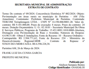 De acordo com registros, a empresa Tercom Terraplanagem já venceu outros contratos junto à prefeitura de Parintins. Em 2020, a empresa recebeu R$ 14,4 milhões para pavimentar as ruas da cidade.
