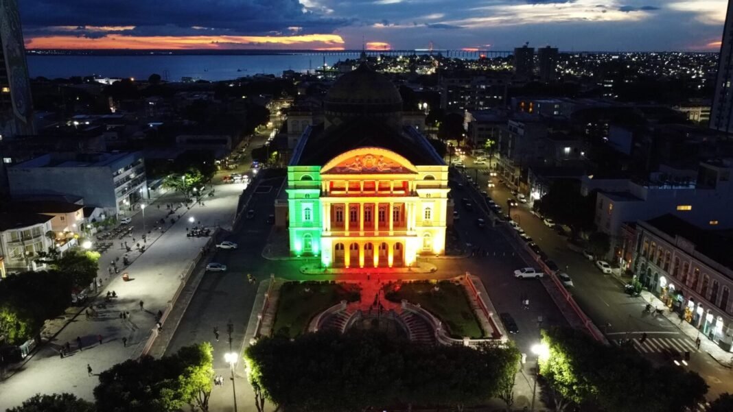 As cores verde, vermelho e amarelo foram refletidas na edificação que representa o principal símbolo cultural e arquitetônico do Amazonas, administrado pela Secretaria de Cultura e Economia Criativa e ficaram acesas até sexta-feira (10/05).