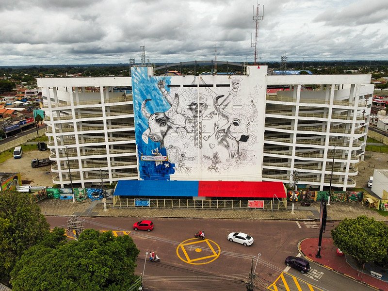 O Mural do Bumbódromo 2024, intitulado “Patrimônio em Festa”, já está em fase final de produção. Com 80% do mural pronto, a expectativa é que o trabalho seja entregue na primeira semana de junho. A arte é de autoria do parintinense Pito Silva, que venceu o edital aberto pelo Governo do Amazonas com exclusividade para artistas do município.